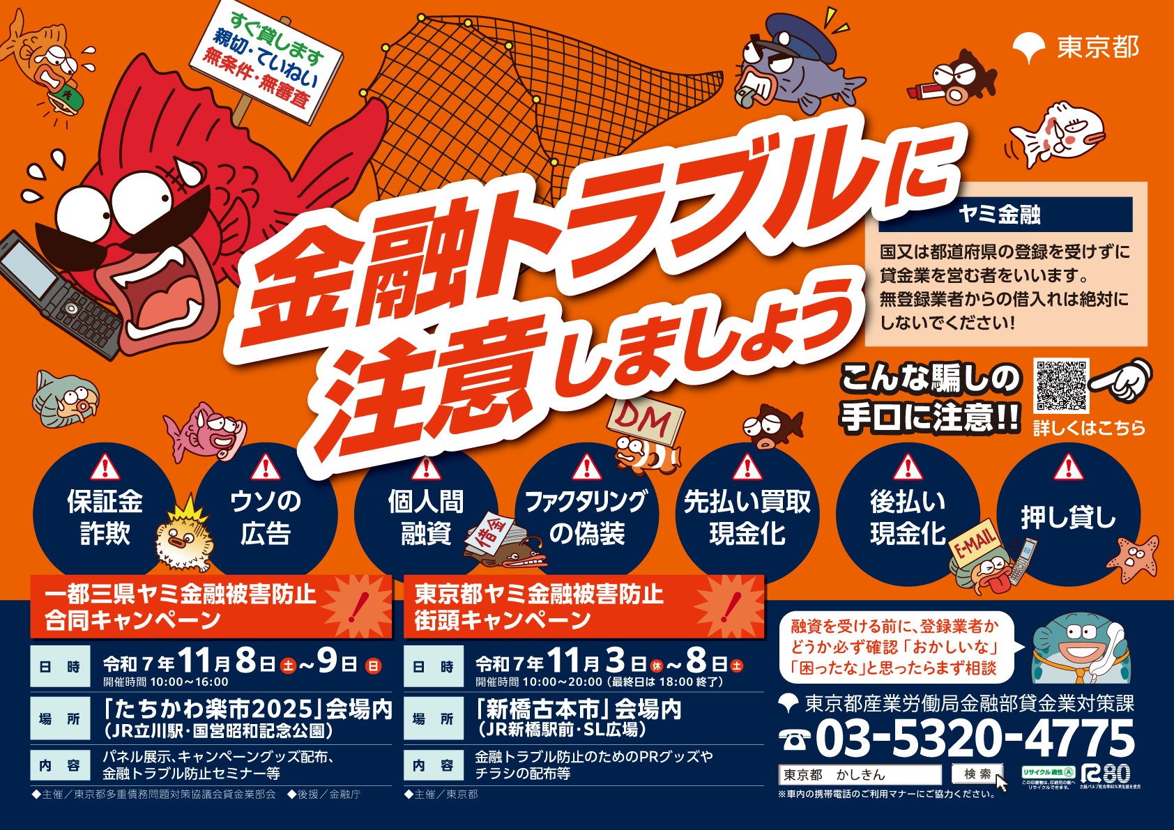 資金需要が高まる年末を控えた11月を「ヤミ金融被害防止強化月間」と定め、今年度は11月3日から9日までを 「一都三県ヤミ金融被害防止合同キャンペーン」期間とし、関係団体と連携して啓発を行います。