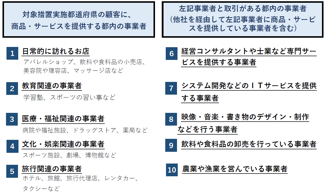 - 都内に本社・本店のある中小企業等及び都内に住所のある個人事業者等であること(業種を問いません)