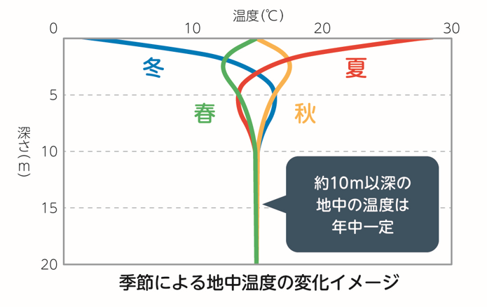 「地中熱」とは、浅い地盤中に存在する低温の熱エネルギーです。深さ10m以深の地中温度は季節に関わらずほぼ安定していて、夏場は外気温度より低く、冬場は外気温度より高い性質を持っています。この夏場や冬場の気中と地中の温度差を利用するのが「地中熱利用」で、冷暖房や給湯、融雪などに利用されています。